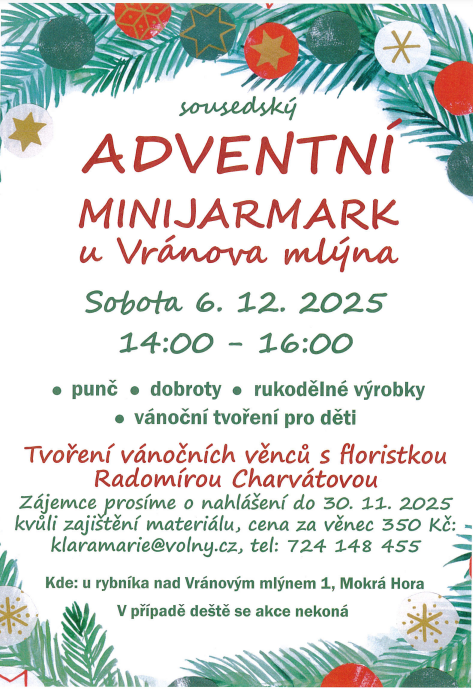 Rádi bychom sdíleli pozvánku na vánoční minijarmark, který se bude konat 6. prosince na Mokré Hoře.