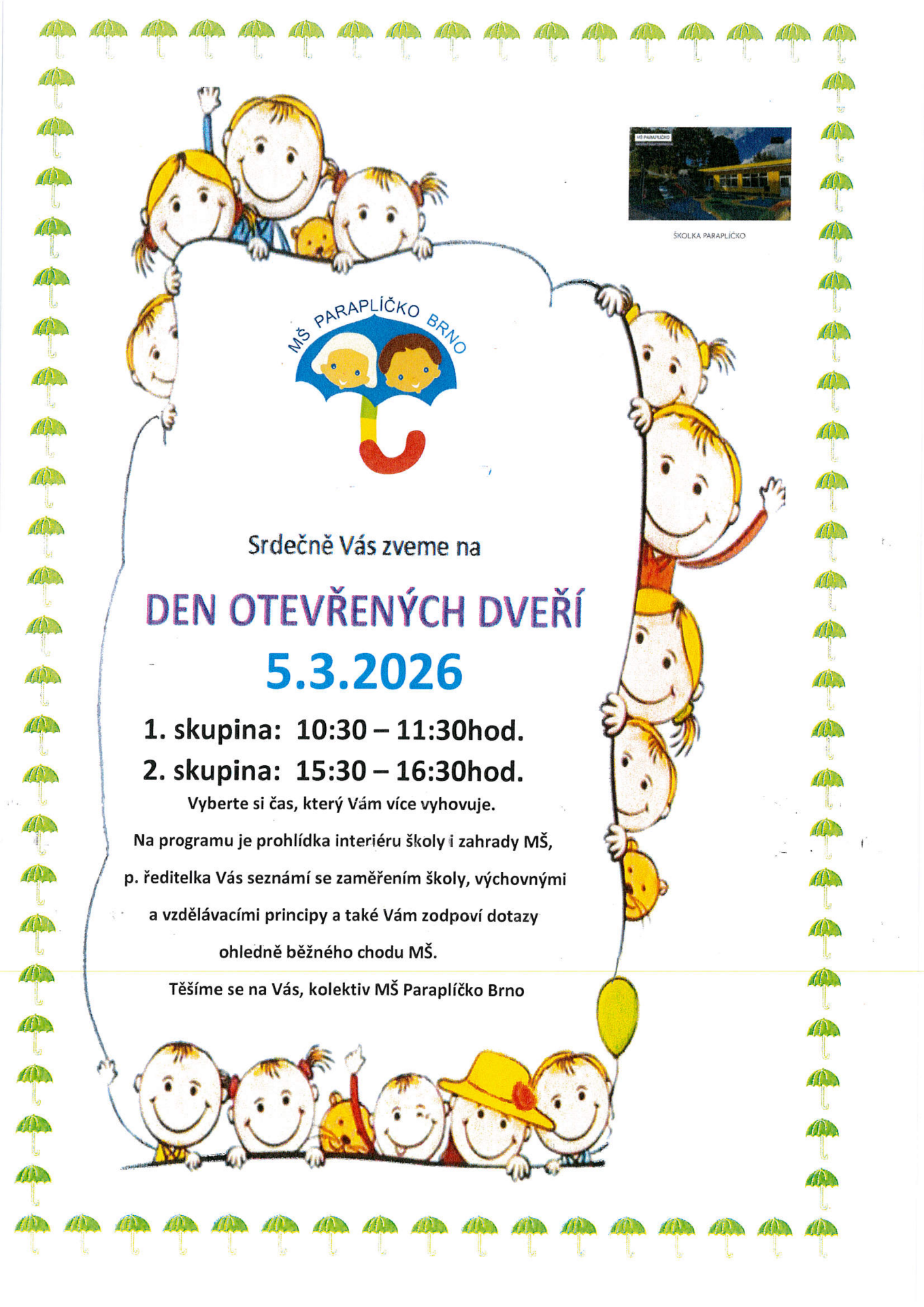 Pozvánka na Den otevřených dveří v MŠ Paraplíčko